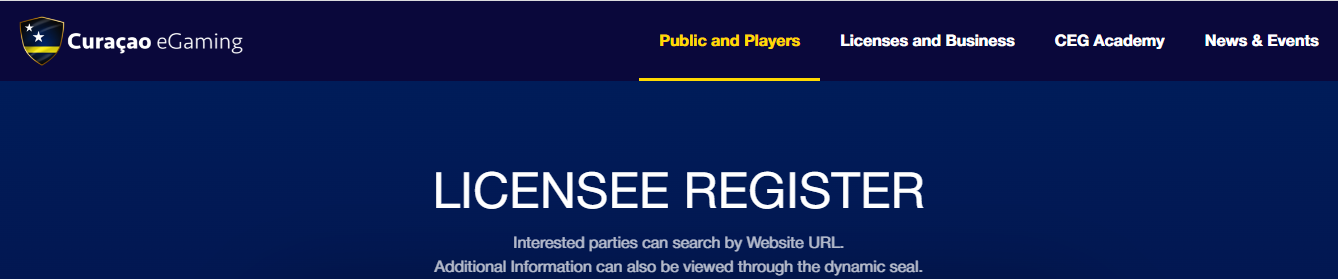Eğer bahis oynadığınız Curaçao lisanslı bahis sitesinin, lisansının doğruluğundan emin olmak istiyorsanız sorgulama yapmanız gerekmektedir. Curaçao lisansını sorgulamak için yapmanız gereken kurumun resmi sitesine girmenizdir. Ardından aşağıdaki görselde olduğu gibi “Public and Players” kısmına giriş yapıp, “License Register” kısmından Curaçao lisansı sorgulaması yapmak istediğiniz sitenin adını yazmanız yeterli olacaktır. Böylelikle Curacao lisans sorgulama yapabilirsiniz.