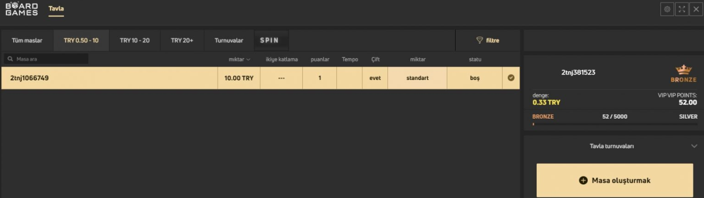 Yukarıda ki görselde de gördüğünüz gibi minimum 0.50 TL ile Maksimum 500 TL aralığında dilediğiniz miktarda oyun masası oluşturabilirsiniz. Bu oyun masalarına yabancı oyuncular katılmak isterse sizin onayınıza sunuluyor. Eğer oynamak isterseniz oynayabilirsiniz. Oynamak istemezseniz reddedebilirsiniz. Masa Oluştur bölümünden istediğini şartlar altında Tavla oyun masası oluşturabilirsiniz. Arkadaşınız ile anlaşarak 20 TL değerinde veya 100 TL değerinde oyun masaları oluşturabilir ve karşılıklı gerçek parasına Tavla oynayabilirsiniz.