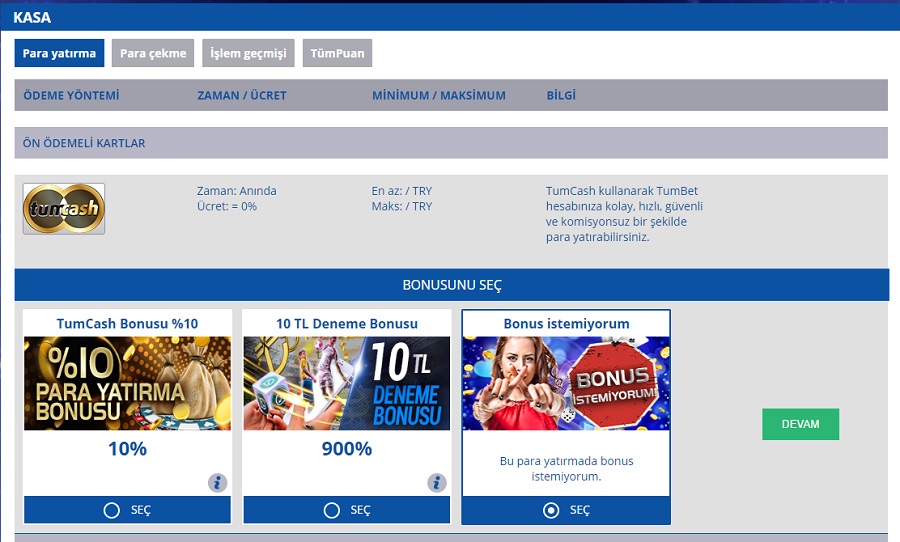 Tumbet’e üye olduktan sonra Para Yatırma Seçeneğine tıklayın ve TumCash’i seçin. Aşağıda açılacak bonus seçeneklerinden